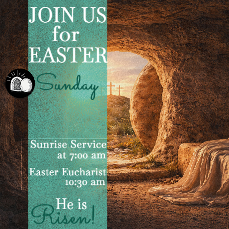 Join us Easter Sunday for either our Sunrise service at 7:00 am or the Easter Eucharist service at 10:30 am. There will be an Easter breakfast at 8:00 am and the youth will have an Egg Hunt and Sunday school beginning at 9:15 am. He is Risen!